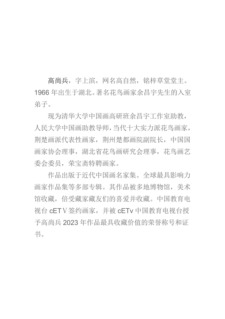 高尚兵,字上滨,网名高自然,铭梓草堂堂主。1966年出生于湖北。著名花鸟画家余昌宇先生的入室弟子。现为清华大学中国画高研班余昌宇工作室助教,人民大学中国画助教导师,当代十大实力派花鸟画家,荆楚画派代表性画家,荆州楚都画院副院长,中国国画家协会理事,湖北省花鸟画研究会理事,花鸟画艺委会委员,荣宝斋特聘画家。
